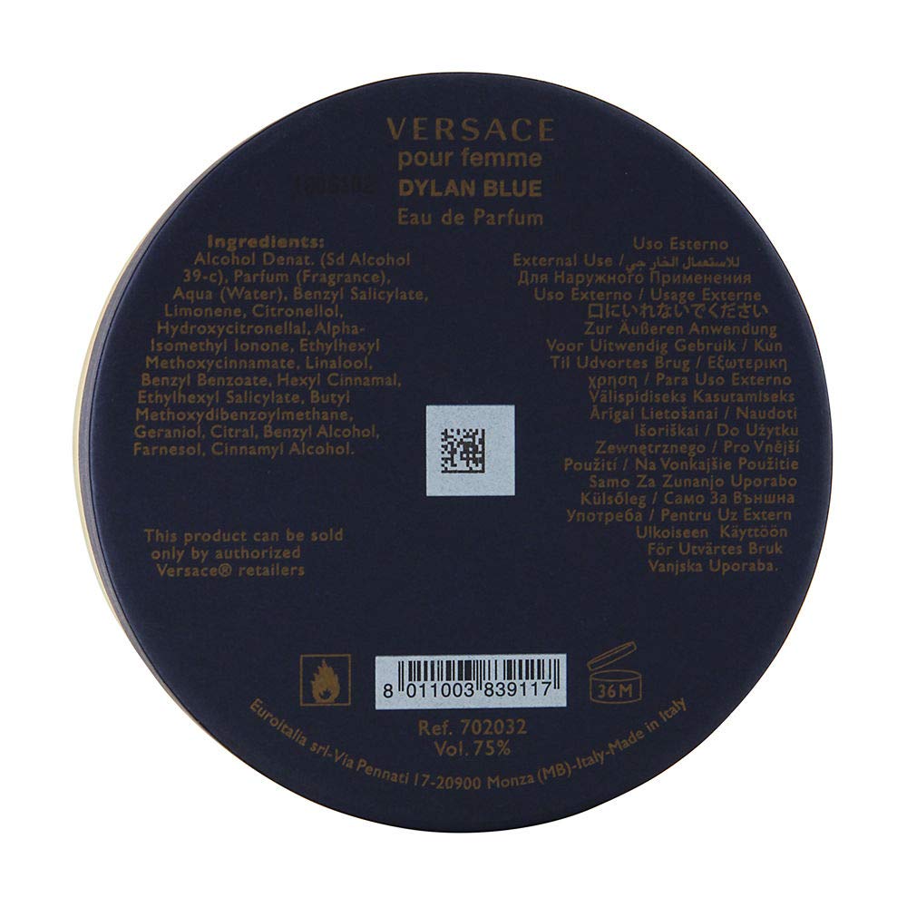 Versace Dylan Blue Pour Femme 3.4 oz Eau de Parfum Spray. Notas de Salida: Grosella negra, Granny Smith, Trébol Notas medias: Rosyfolia, Melocotón helado, Jazmín Notas de fondo: maderas lisas blancas, almizcle, pachulí